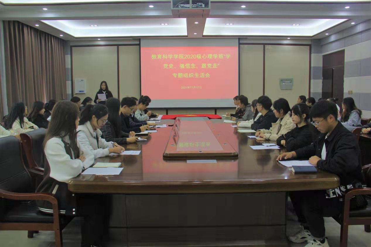 时间:2021-11-18 17:51:38 来源:教科院新闻部 作者:马玉娇 曹童然 阅读: 次11月11日至17日,教育科学学院各团支部陆续召开“学党史、强信念、跟党走"专题组织生活会。17日邀请校团委副书记张鹏、校团委组织部老师余艳楷指导2020级心理学班团支部组织生活会,学院党委书记房加帅,团委老师朱方、田园以及2020级心理学班团支部第一小组成员参与本次会议,会议由该班团支书王琳主持。