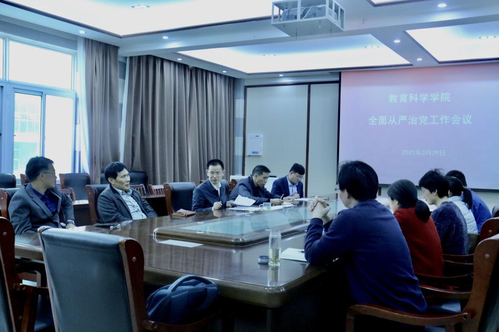 李辉强调,领导班子一要提高认识,提升站位。要进一步提高对全面从严治党重要性的认识,自觉把思想和行动统一到习近平总书记重要讲话和上级有关会议精神上来二要加强学习,提升政治能力。三要扛稳责任,勇于担当。要切实把全面从严治党要求落实到工作各方面各环节,营造学的氛围、严的氛围、干的氛围增强责任,担当作为,奋力推动教育科学学院各项事业高质量发展,以优异成绩向党的百年华诞献礼。