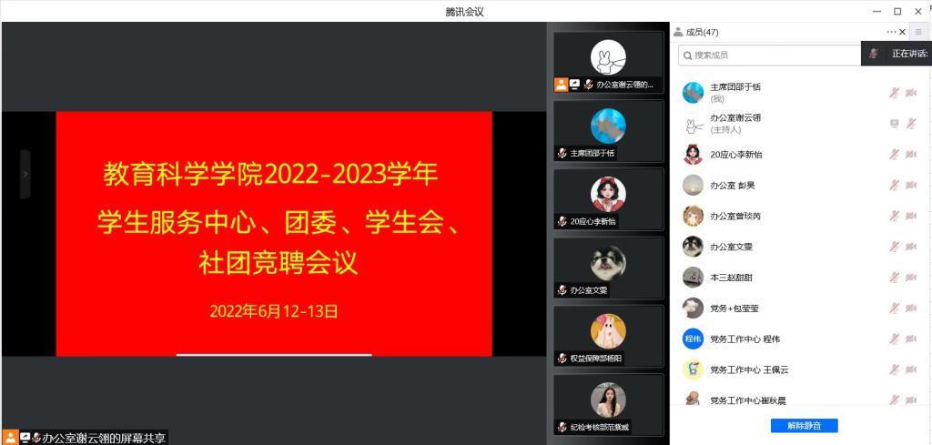 时间:2022-06-19 19:39:08 来源: 作者: 阅读: 次6月13日至6月14日,教育科学学院线上召开2022-2023学年学生服务中心、团委、学生会、社团工作人员竞聘大会。主席团成员、各部门部长、副部长以及此次竞聘人员参加会议。会议由办公室主任谢云翎主持。