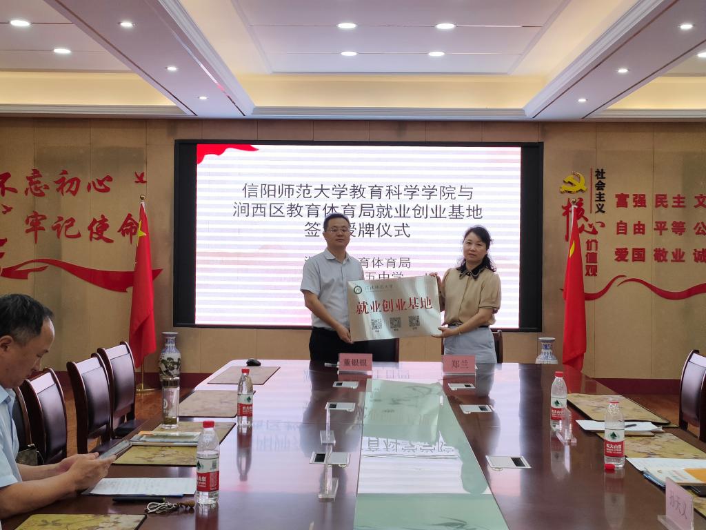 董银银一行来到洛阳市涧西区教育体育局、洛阳国宏园区发展有限公司进行访谈调研。单位负责人介绍了各自的建设发展情况以及人才需求情况。董银银对教育科学学院的基本情况、师资力量、学科专业建设以及2023届毕业生情况等作了详细介绍。座谈会上,校企双方围绕协同育人、开拓就业岗位、创新实践等方面进行深入交流。活动最后,教育科学学院党委副书记董银银代表学院与洛阳市涧西区教育体育局、洛阳国宏园区发展有限公司分别签订校企合作协议并授予“信阳师范大学就业创业基地”牌匾。