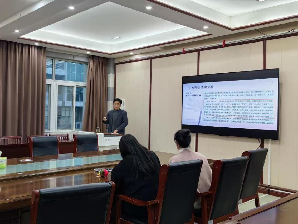 会议有两项议程。第一项,由房加帅书记为与会老师和研究生做学术讲座。讲座题目是《同事关系会影响高校教师教学学术吗?》。房书记首先介绍本次讲座的题目源自其博士论文,论文的主要内容是探讨同事关系对教师教学学术绩效的影响,此次主要分享为何选择这个问题。从对选题缘由的发问开始,房书记把研究问题、学术史回顾、研究设计、重点概念、研究结论研究等方面向听众娓娓道来,最后分享了三个选题经验:在工作中发现问题,做行动研究;在学术史回顾中深化问题,做学理分析;跳出具体问题探究问题,做跨学科研究。