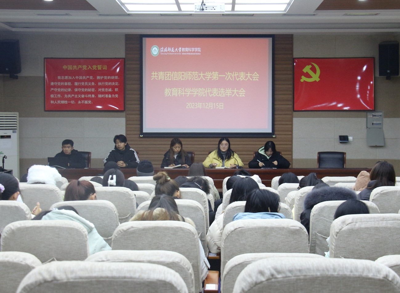时间:2023-12-16 19:51:17 来源:教科院新闻宣传中心 作者:吴宇熙 祐亚菊 阅读: 次根据《关于召开共青团信阳师范大学第一次代表大会的通知》要求,12月15日,共青团信阳师范大学第一次代表大会教育科学学院代表选举大会于教科楼301会议室召开。专职辅导员杨艺卓、学生会执行主席李玮莹、分团委副书记董洁,以及团员代表出席会议。会议由杨艺卓主持。