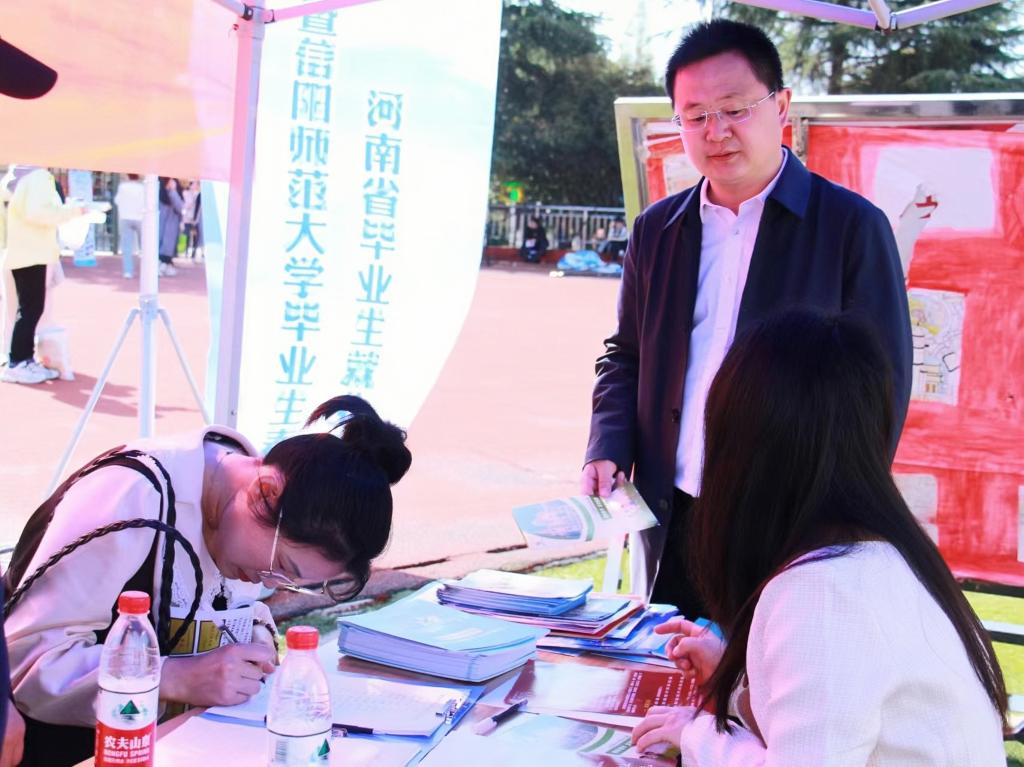 时间:2024-04-02 10:37:28 来源:教科院新闻宣传中心 作者:吴宇熙 祐亚菊 阅读: 次为抢抓春季就业工作关键期,落实做好高校毕业生高质量充分就业工作,3月28日,信阳师范大学2024届春季校园双选会在西操举行,我院积极组织2024届毕业生参加此次双选会。教育科学学院党委副书记董银银以及毕业班班主任前往双选会现场,与用人单位热切交流并指导2024届毕业生求职。