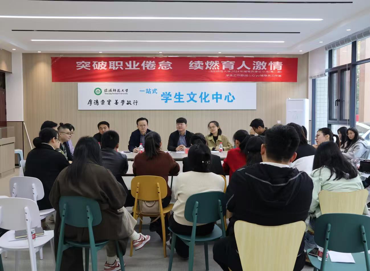11月12日,由学生工作部主办,心yu辅导员工作室承办的辅导员理论沙龙(第二期)在“一站式”学生文化中心举行。本次沙龙邀请教育科学学院副院长、心理学博士孙天义教授作为主讲嘉宾,以“突破职业倦怠,续燃育人激情”为主题做辅导交流,学工部相关负责同志、各学院党委副书记和辅导员代表共20余人参加。