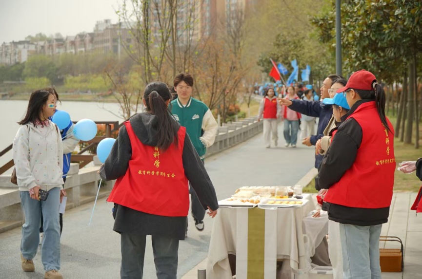 活动前,我院党委副书记缑星、专业教师朱欲晓对活动志愿者进行培训。活动当天,参与者身着蓝色马甲,象征着对孤独症团体的关爱与支持。志愿者们早早来到集合地点,脸上洋溢着热情的笑容与孩子及家长互动。上午9点整,徒步活动正式开始,大家高举写着“有爱无碍、自主自在”等标语的旗帜,从茶韵广场出发,沿浉河南部滨河步道有序进行。4.2公里的路程,志愿者拉着小朋友的手一路耐心陪伴、细心呵护。沿途的风景与温暖的互动,让孩子们的脸上渐渐绽放纯真的笑容。徒步过程中志愿者和孤独症家庭一同探访友好商户,这些友好商户早早挂上了特制的友好挂牌,通过与社区的活动进一步增强孤独症儿童的社会参与。