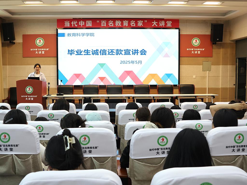 为强化毕业生诚信意识,规范国家助学贷款还款流程,5月14日下午,教育科学学院于教科楼301举办2025届毕业生诚信还款专题宣讲会。本次活动由专职辅导员刘然然主讲,贷款毕业生参与学习,共筑诚信还款防线。