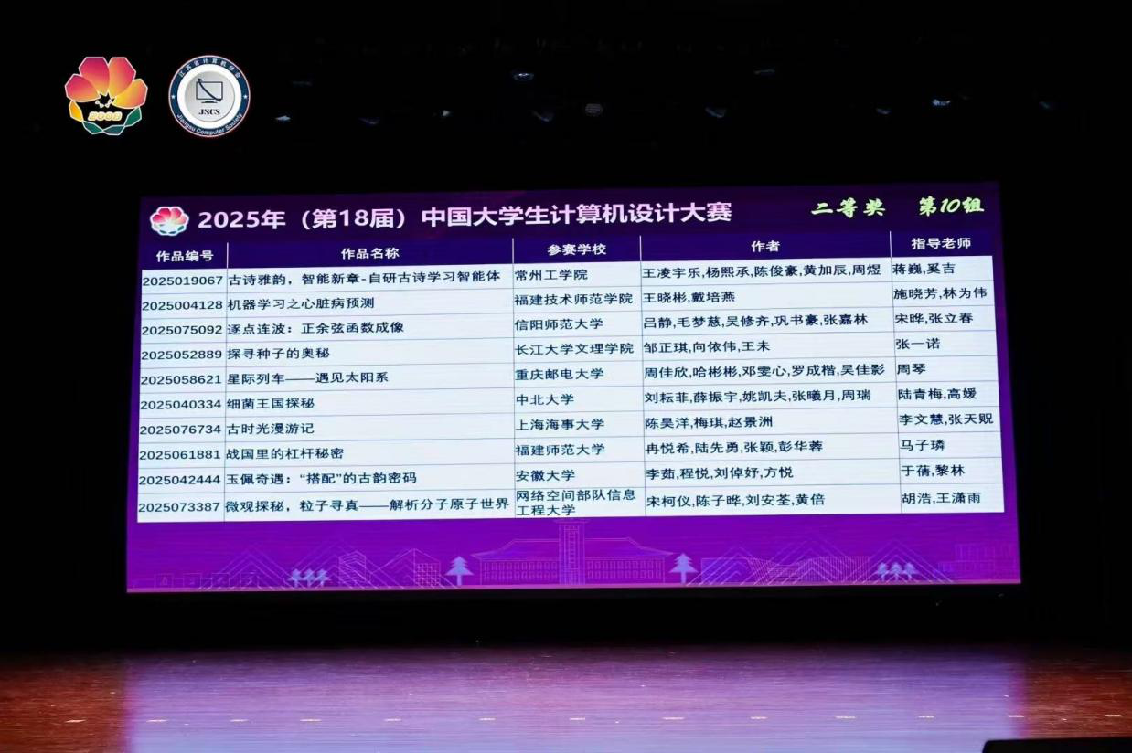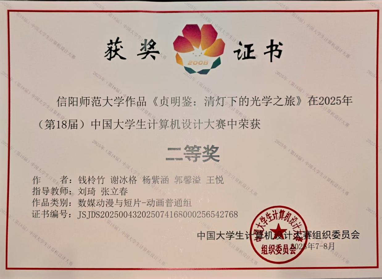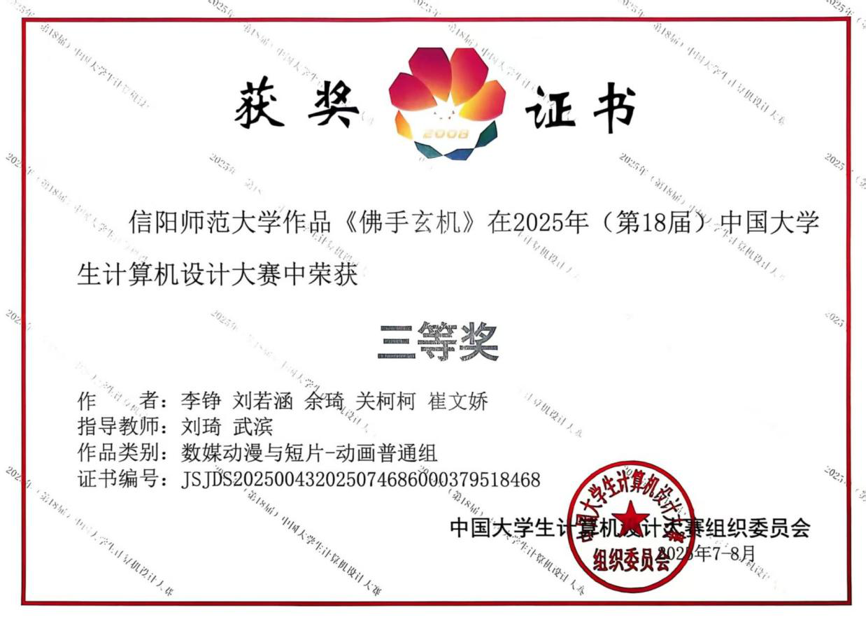 近日,2025年(第18届)中国大学生计算机设计大赛全国总决赛圆满落幕。我院师生积极参与,组织了两支队伍分别参加不同赛区的角逐。7月22日—26日,由张立春老师带队,前往南京南决赛区参加微课与AI辅助教学类别比赛;8月13日—17日,由刘萱老师带队在南京东决赛区(东北师范大学)参与数媒动漫与短片类别比赛。经过激烈的比拼,我院共斩获二等奖两项、三等奖一项。