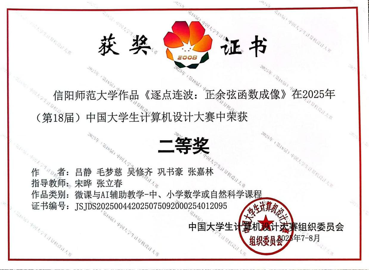 继省赛中三组作品入围,刘琦、张立春老师指导的《贞明鉴:清灯下的光学之旅》、宋晔、张立春老师指导的《逐点连波:正余弦函数成像》获国赛二等奖,刘琦、武滨老师指导的《佛手玄机》获国赛三等奖。