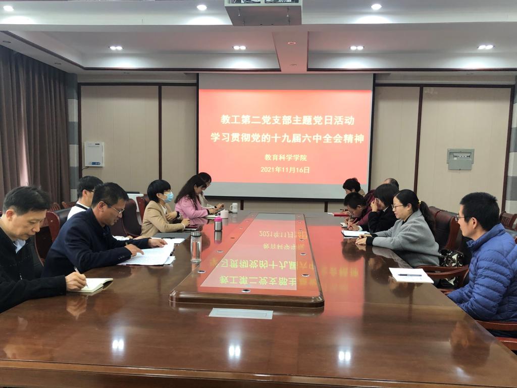 中国共产党第十九届中央委员会第六次全体会议于2021年11月8日至11日在北京举行。连日来,教育科学学院广大师生密切关注全会盛况,认真研读全会公报和习近平总书记的重要讲话,不断深入学习贯彻党的十九届六中全会精神,学院党委中心组、党支部分别开展全会精神学习研讨活动。