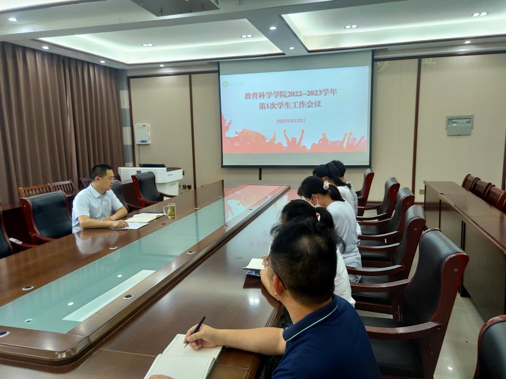 时间:2022-08-23 18:57:33 来源: 作者:牛洁楠 阅读: 次8月23日上午,教育科学学院2022-2023学年第一次学生工作会议在教科402召开,院党委副书记董银银、全体辅导员参加会议,会议由董银银主持。