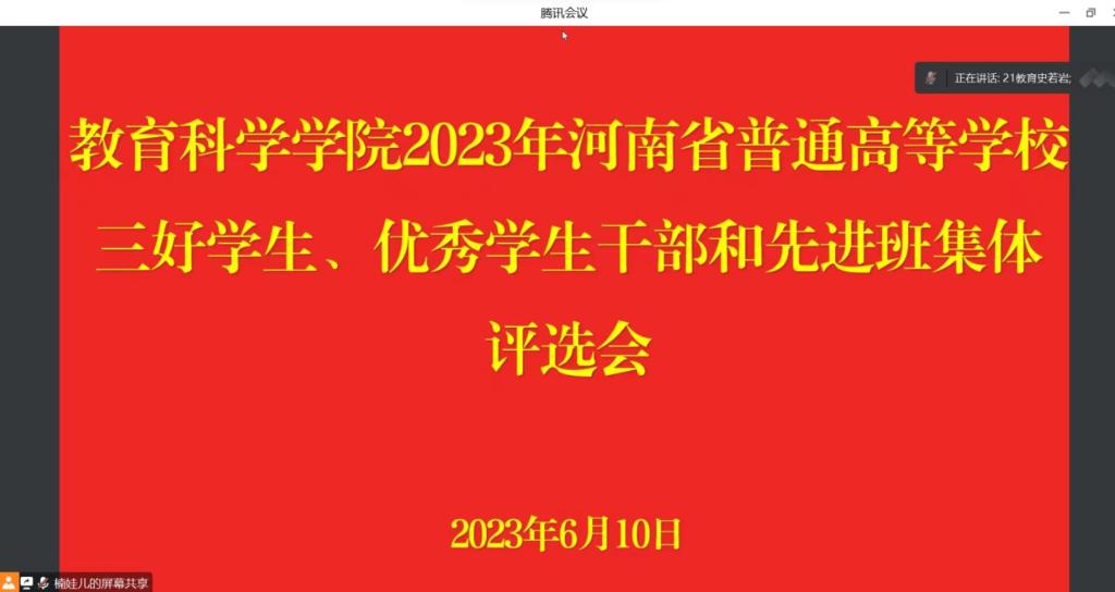 时间:2023-06-10 20:30:43 来源:教科院新闻宣传中心 作者:刘至涵 郭鑫瑶 阅读: 次6月10日,教育科学学院于线上召开2023年河南省普通高等学校三好学生、优秀学生干部和先进班集体评选会。院党委副书记董银银,分团委书记牛洁楠,专职辅导员田园、杨艺卓、提尼格尔出席此次会议。会议由牛洁楠主持。