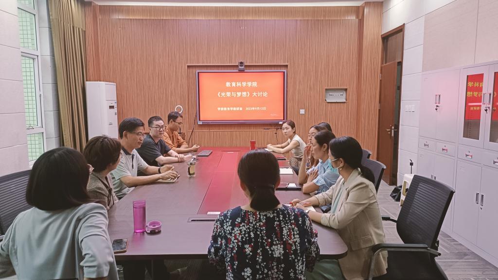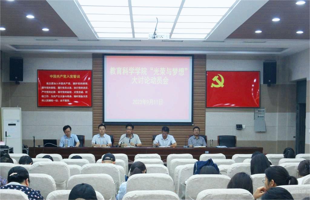 召开动员会。9月11日,教育科学学院全体教职工在教科楼301会议室召开了教育科学学院“光荣与梦想”大讨论动员会,会议由学院党委书记房加帅主持。会上首先观看了校党委书记王文鹏同志创作的《光荣与梦想》诗朗诵,全体教师无不动容。随后,院长何安明结合学院发展实际,分析了教科院的“光荣与梦想”。党委书记房加帅提出全体教职工要培养工匠精神、竞争精神和创新精神,以积极的心态和状态,开启新征程,开创新荣光。