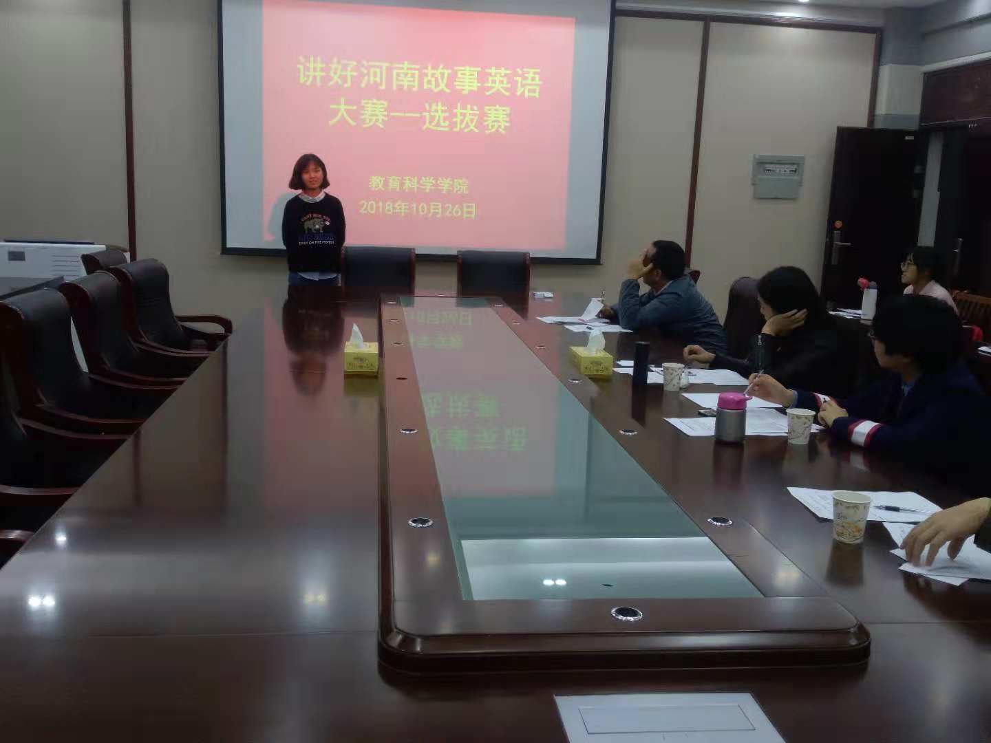 时间:2018-10-29 15:37:38 来源: 作者: 阅读: 次根据《河南省教育厅等四部门关于组织全省大学生讲好河南故事英语大赛的通知》的精神,组织大学生用英语讲好河南故事,传播好河南声音,促进中外人文交流,推动中原更加出彩。2018年10月26日晚上,我院在教科402举办校内选拔赛———初赛。