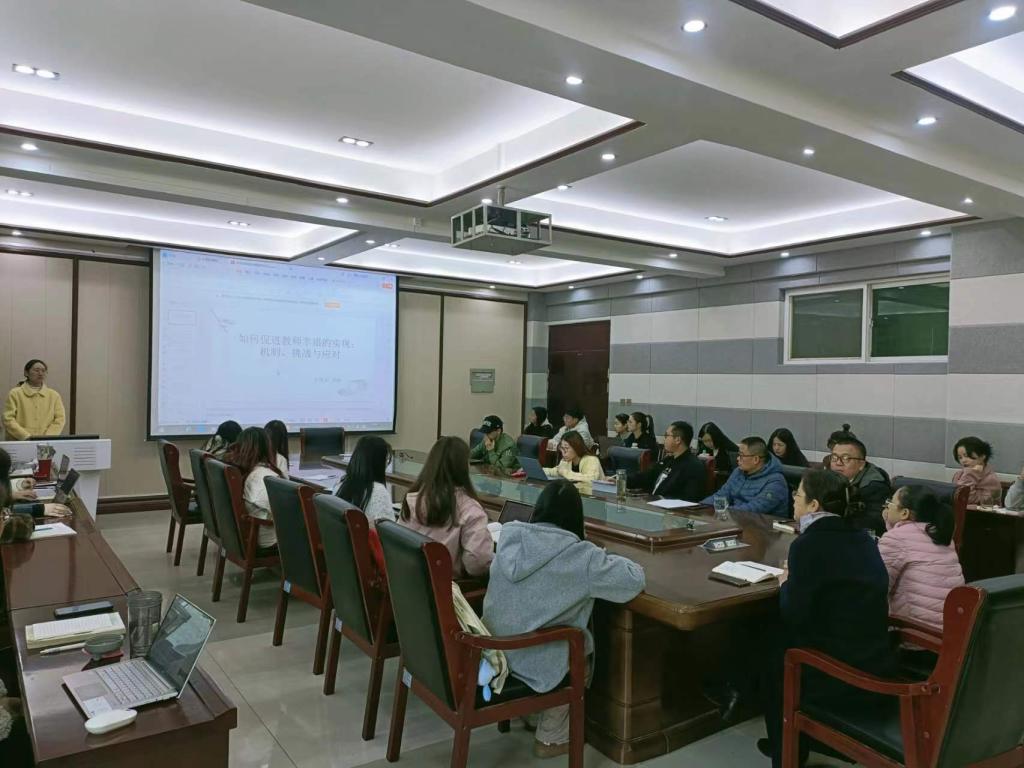 研讨会开始,部分学生展示自己的论文,在座老师进行指导。在分享的过程中,金老师就教师幸福指出:“幸福有主观、客观的区别,个体对于幸福的认识不一样,得到的结果也不一样。”对于高质量教育公平方面,邢老师提出:“高质量公平有没有具体的标准?加不加高质量这个词对于论文有何影响?”接下来,教师们对于教师交流轮岗展开激烈的探讨,杨老师指出“教师交流轮岗制度可以促进教育均衡发展,但这对于教师个人而言是否正义?”张老师说:“所处环境不同,对于教师交流轮岗的看法也不一样。采取哪些轮岗政策应立足于实践,要证实策略的合理性,而不是根据自己的想象去提策略。”关于学生批判性思维培养方面,武老师说:“如何促进学生批判性思维的发展,我们通过引导学生与人工智能的对话来发展学生的批判性思维。通过使用AI来引导学生发展批判性思维。”